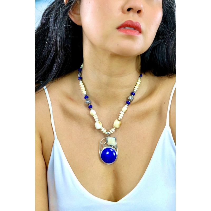 Fossil Walrus Ivory, Lapis & .925 Sterling Silver Necklace Size - 17" lengthPendant Size -1 7/8"L x 1 3/8"WFossil information card & velvet jewelry pouch includedOne of a kind
