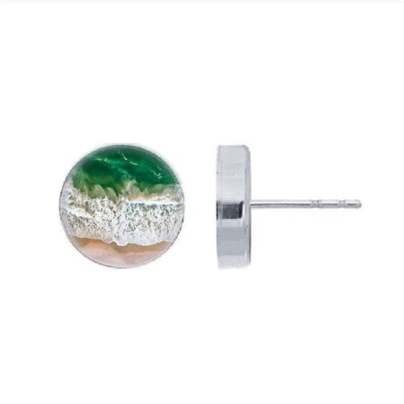 Bring the beach with you wherever you go with these Jersey Shore inspired earrings! With a wash of vibrant greens, these sparkling earrings feature a stunning aerial photograph of the Atlantic surf perfect for any beach lover or New Jersey local.