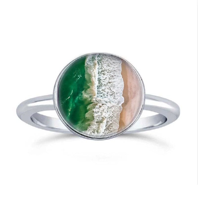 Bring the beach with you wherever you go with this Jersey Shore inspired ring! With a wash of vibrant greens, this sparkling ring features a stunning aerial photograph of the Atlantic surf perfect for any beach lover or New Jersey local.