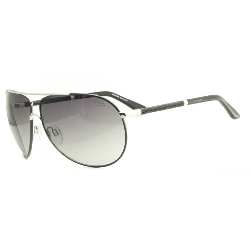 JAGUAR Full Rim Sunglasses - 100% Authentic - Mod. 37901 - 650 Filter 2Polished silver over matte charcoal black metal frames, silver hinges with black leather armsGloss black acetate end coversGrey gradient tinted lensesPrecision spring hinges and adjusta
