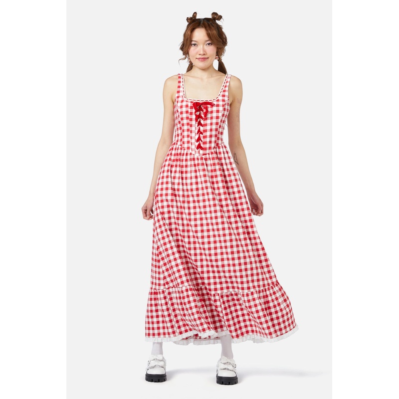 Gingham Dress-Features Custom 'Jam' Gingham-Corset Style Bodice With Flowy Skirt-Includes Adjustable Laced Front-Soft Handfeel-Made From Cotton Elastane Blend-Available In RedProduct Code: DGFY157