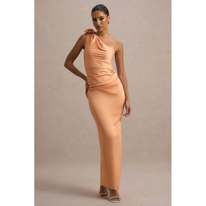 Feminine and delicate, say hello to the ultimate maxi of the season, Janette. Designed to excude elegance this piece is cut in our premium satin in a captivating shade of peach, ensuring to compliment every skin tone. The asymmetric neckline is elevated with a delicate and detailed rosette, while your waistline is enhanced with chic draped detailing. Perfect for bridesmaids or upscale events this season, style with dainty jewellerry and let the dress do the talking.