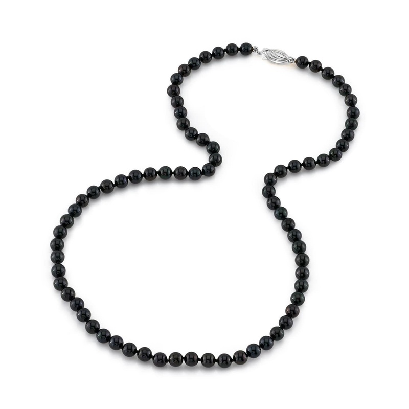 This exquisite piece features stunning black Akoya pearls, each ranging in size from 5.0 to 5.5mm. The necklace showcases a captivating array of Midnight-Blue to Greenish Black colors. These AAA quality pearls are perfectly round, strung together with matching black silk thread, and meticulously double-knotted between each pearl. Crafted by hand in our Los Angeles workshop, this necklace is finished with a beautiful 14K Gold clasp, with premium options available upon request. When you wear this necklace, you carry a piece of elegance that complements your sophisticated lifestyle.