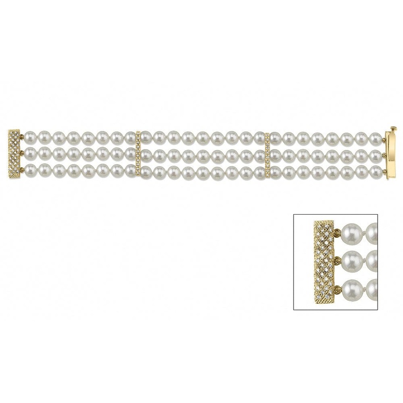 This exquisite bracelet features stunning AAA quality Japanese Akoya pearls with exceptional luster. You’ll appreciate the elegance of the three pearls, beautifully complemented by a clasp adorned with over one carat of high-quality SI1 diamonds. The standard size of the pearls ranges from 7.5 to 8.0mm, but you can easily customize this piece to feature larger pearls if that’s what you prefer. Each bracelet is meticulously crafted on-site by our experienced GIA certified specialists, ensuring a beautiful piece that you’ll cherish for years.