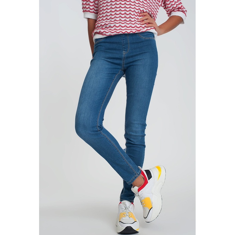 Jeggings in Dark Wash. What are jeggings? They are leggings made of stretchy fabric that look just like jeans. With the look of a pair of skinny jeans, jeggings are made from thinner fabric. Jeggings also look like they have front pockets, but the appearance of pockets is created by stitching. They do have 2 real back pockets, however. These jeggings are made of 98% Cotton and 2% Elastane. The cotton makes them breathable. Elastane, also known as Spandex, is a great addition to denim when making leggings. Stretchiness in your leggings is caused by the elastane. Another benefit is that elastane provides a body-hugging effect, so your leggings will not lose their shape. Wear these jeggings with any t-shirt, top, or sweater that you would wear with your jeans. We pair the jeggings here with our knit jumper in red, which is sold separately. Because of their skinny fit, you can wear them with booties or western boots. You can also pair them with sneakers as shown. The model is 58 with measurements of 31-23-34 and is wearing a size Small. The fit runs true to size.