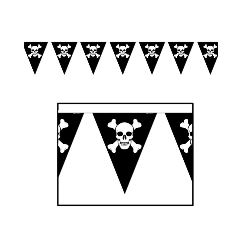 Item Includes:Banner.Fit and Sizing:3.7m x 25cm / 12in x 10ft.Pirate party timeHang this plastic Jolly Roger Pennant Banner around the party venue for a great pirate style decoration. This bunting features white skull and crossbones on a black background a