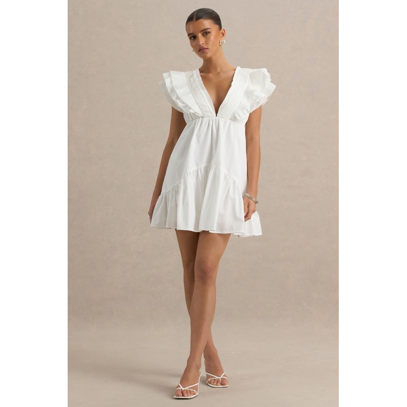 Playful and feminine, Judie is the ultimate summer dress for every girls wardrobe. Crafted in a classic white shade of our premium stretch cotton poplin, this flirty mini dress will see you through all occasions this season. Designed with a daring, plunge ruffled neckline and intricate ruched detailing, Judie will effortlessly capture the rooms attention. From garden parties to sunset cocktails, in this gorgeous piece you will exude utter chicness.
