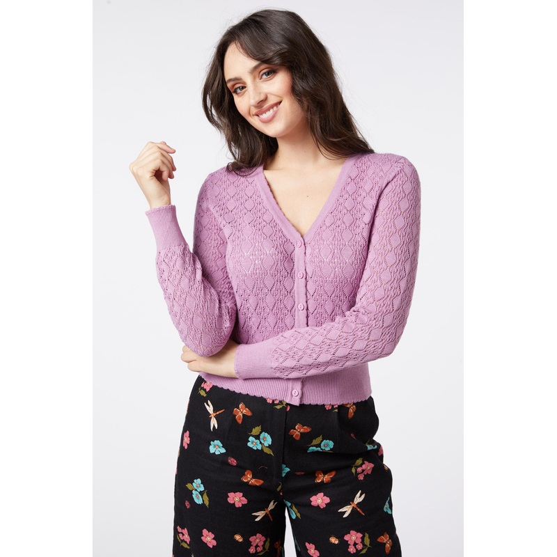 Lace knitted cardi- long sleeve- v shaped neckline- sleeve & hem ribbing- knitted in an acrylic cotton blend- available in lilac & blackProduct Code: PGFV130103