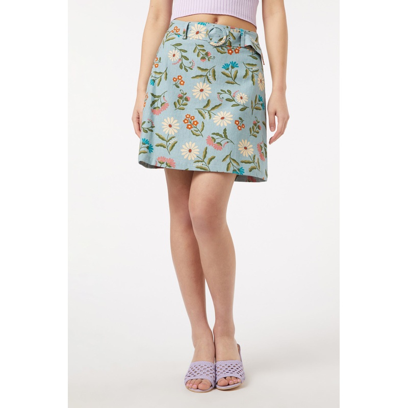 Floral mini skirt- a romantic European craft style floral with tossed flowers and lovely flow- a-line, highwaisted skirt- back zipper & button closure - detachable matching self fabric belt- available in greenElle wears a size 8 she is 178cm tall, with a 7