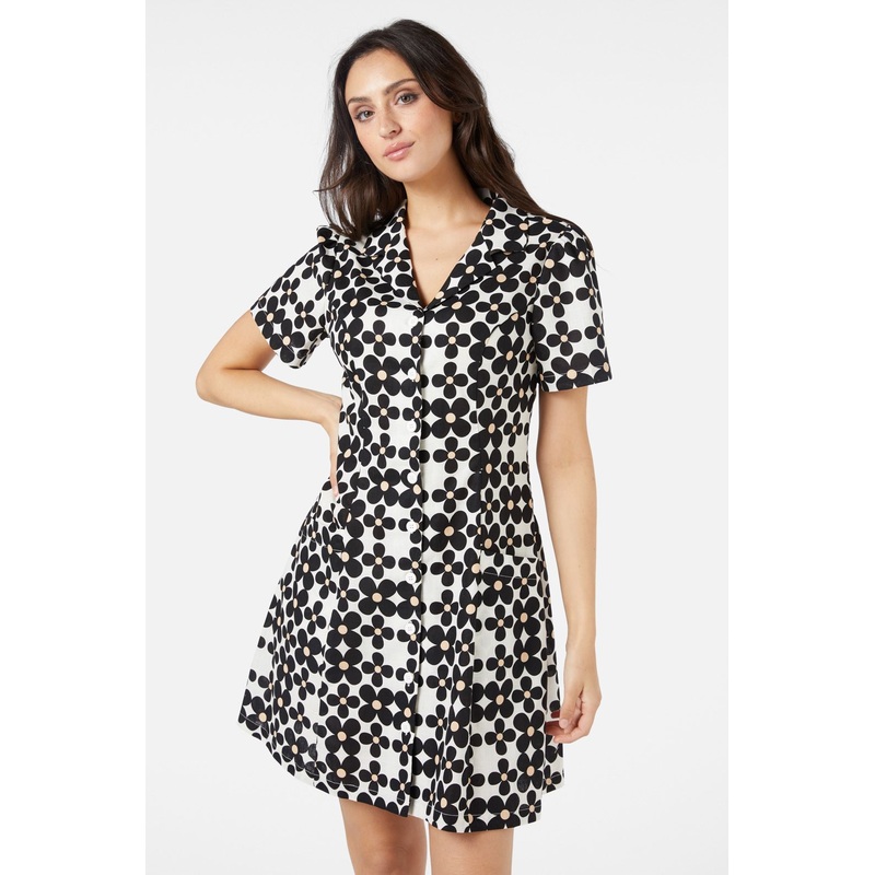 60s style retro flower printed shirt dress, so cute and fresh!- a retro style with open collar and button down front- flared a line skirt- handy pockets- side ties for a cinced looks- made of a textured cotton- available in blackProduct Code: PGFY198