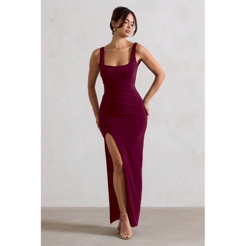 Kate | Berry Square Neck Maxi Dress with Plunge Back and Side Thigh Split