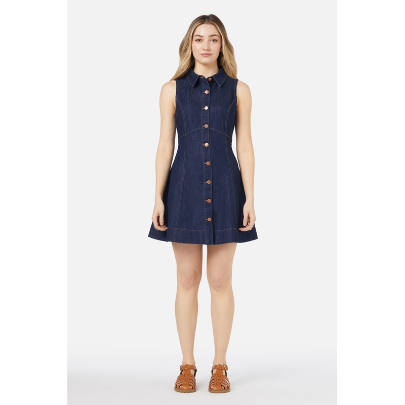 Dark cotton denim sleeveless mini dress, with button front, pointed collar, underbust seam & flared skirt. A casual transeasonal style for spring- copper styled button through front - classic pointed collar - flattering underbust seams - mini length with f