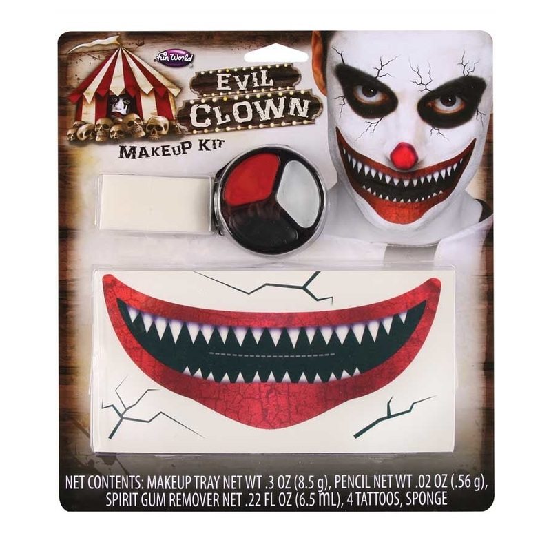 Freak show time!Make your creepy clown costume look truly unhinged with this Killer Clown Makeup Kit. The kit includes a large temporary tattoo of a menacing grin to be worn over the mouth and three crack tattoos for the face. The makeup palette includes r