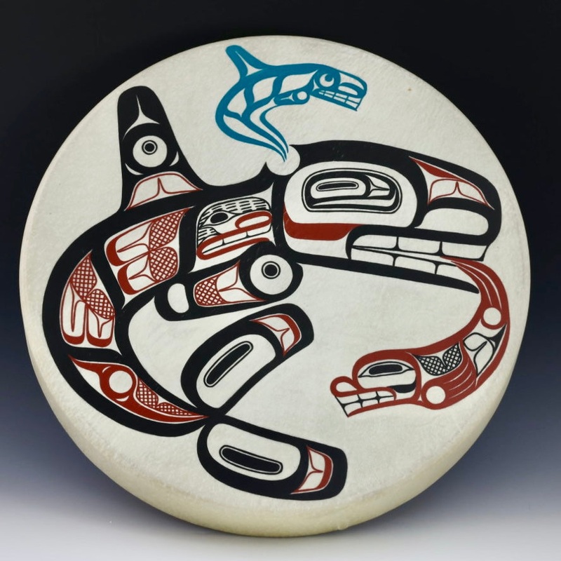 Handcrafted Deerskin 18″ drum is hand painted by renowned Native Alaskan artist, David Boxley
