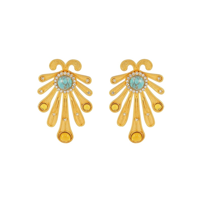 The Kiss Fish Earrings feature simulated turquoise cabochons, coloured resin cabochons, and Swarovski rhinestones set in brass with a 24k yellow gold overlay.The Kiss Fish Earrings capture the whimsical essence ofSonia Petroffs latest collection, and are i