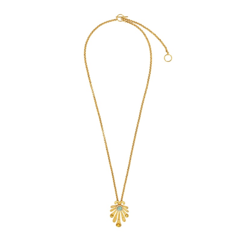 The Kiss Fish Necklace features a simulated turquoise cabochon, coloured resin cabochons, and Swarovski rhinestones, all set in brass with a 24k yellow gold overlay. Inspired by the natural, earthy hues of a garden pond, this piece reflects Sonia Petroffs