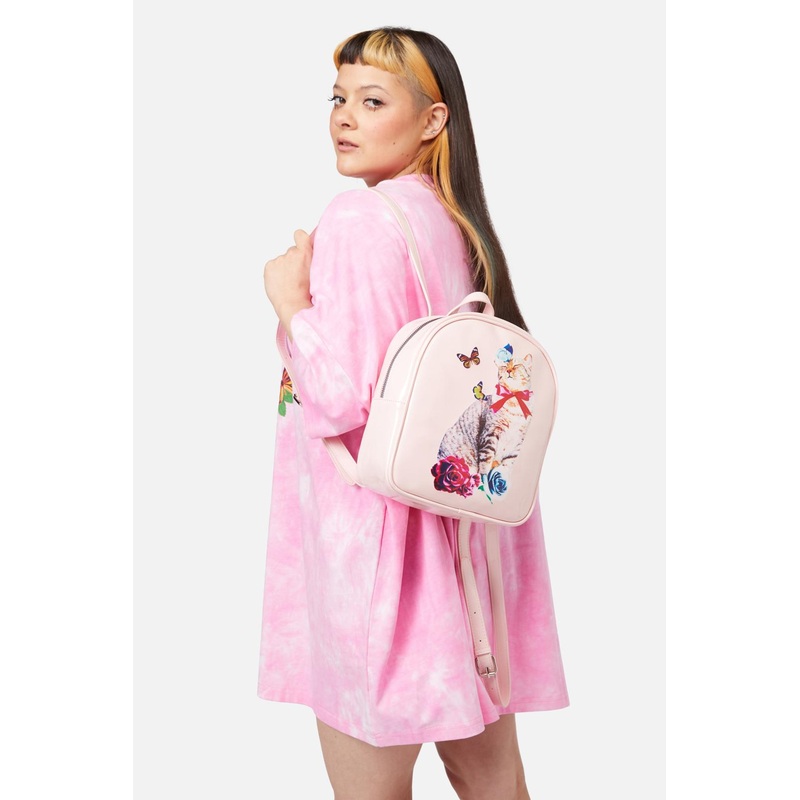 Kitsch Kitties Bag- A fun and cute patent backpack- Soft pink in colour- Kitty in a kitsch design- Flowers, butterfly and bows- Silver toned hardware- Adjustable straps- Approximately 25cm x 22cm in size Product Code: DWFY332