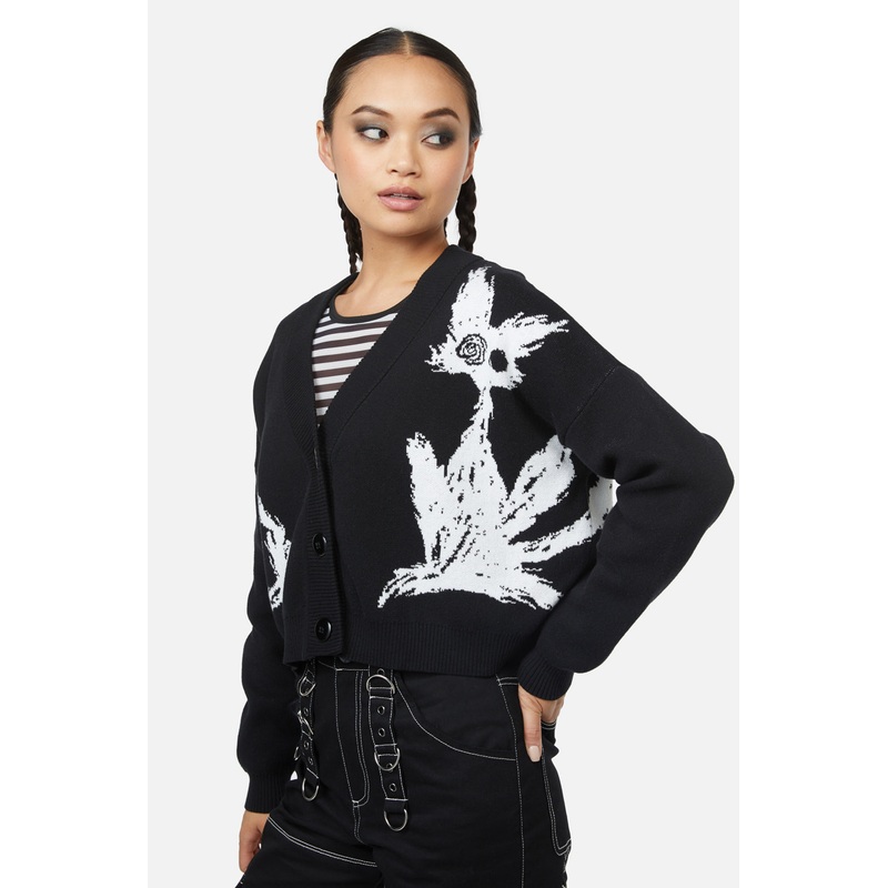 Intarsia Cardigan-Features 'kitty' Intarsia Artwork-Boxy Cut-Relaxed Fit-Button Front-Made From Nylon & Acrylic Blend-Available In BlackProduct Code: BGFX179