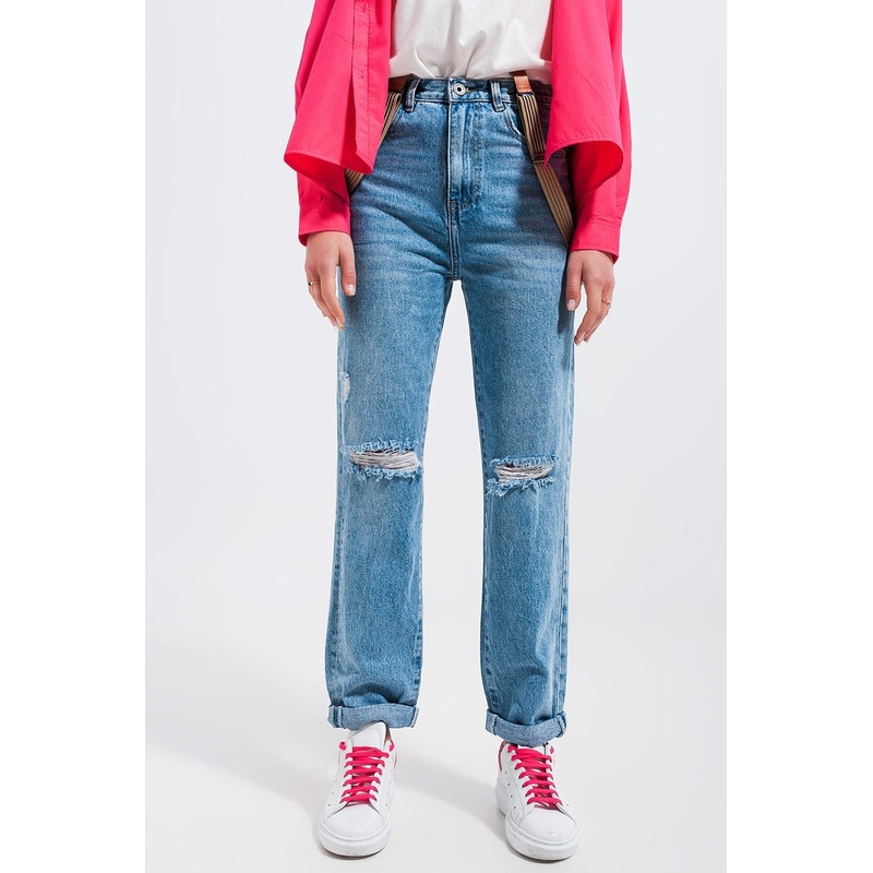 These straight-leg light-wash jeans boast of distressed styling at the knees, a high waist, five functional pockets, belt loops, and a zip fastening. The fabric is made from 100% Cotton. These are comfy and perfect for a casual day. We pair the jeans with