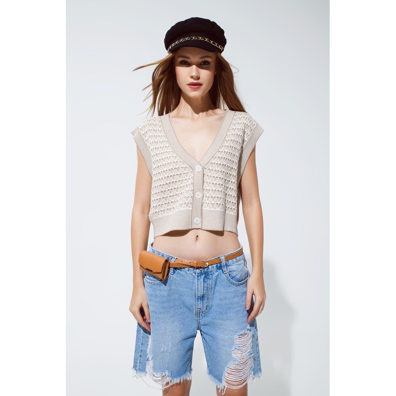 Knitted Cropped Vest With Rib Trim In BeigeStay stylish with this cropped knitted vest in beige. It features ribbed-style trims and a front button closure. This versatile piece is perfect for fall; wear it with a white shirt and a faux leather skirt for a
