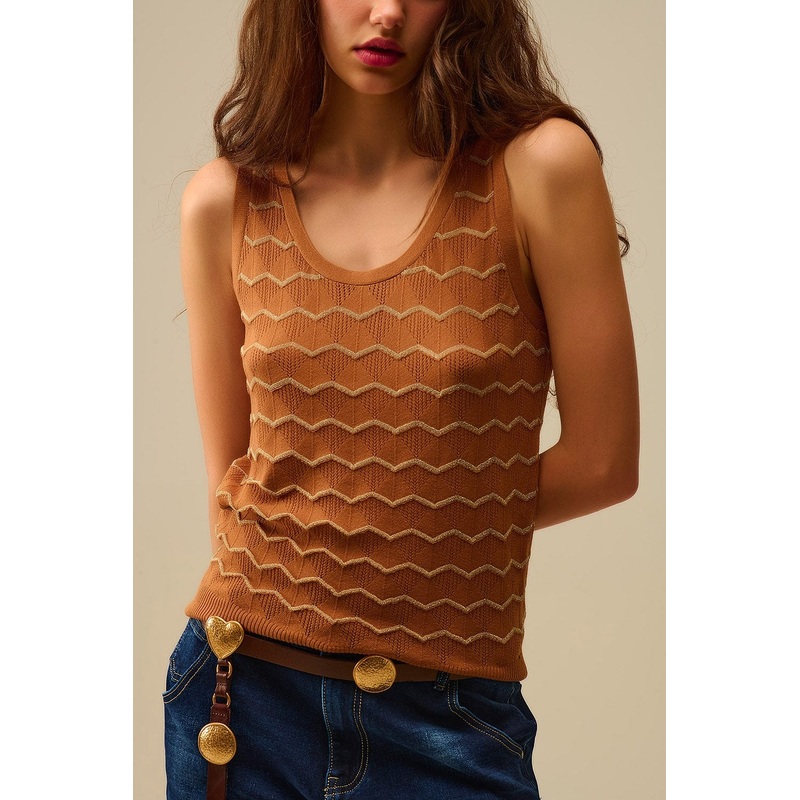 Refined yet striking, this sleeveless knitted sweater adds a touch of shimmer to your everyday wardrobe. Woven in a rich brown hue and accented with a golden zigzag pattern, it catches the light with every movement. The classic crew neckline frames the collarbone gracefully, while the slim, regular fit flatters without clinging.