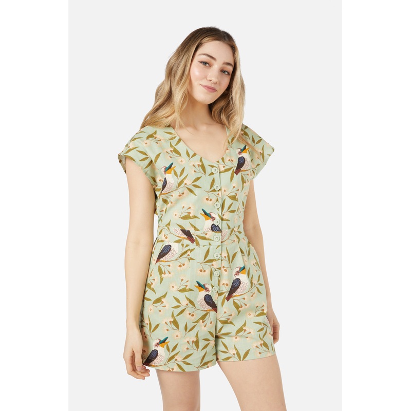 Kookaburra printed playsuit, a cute romper with button through front & wide shoulder. Featuring our charming Kookaburra sitting amongst the gumnut flowers- short length wide cut leg - button through front- v shaped neckline- handy side pockets - made of a
