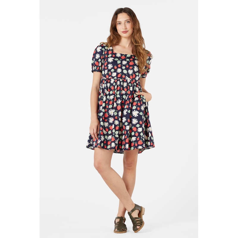 Printed short sleeve mini dress featuring sweet strawberries and fresh daisies- short puff sleeve with cuff and button- soft square neckline- high bodice- gathered skirt finishing above the knee- invisible centre back zipper- made of a smooth cotton- avail
