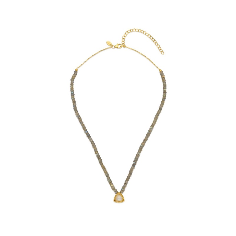 TheLabradorite Pyramid Necklacerepresentsfemininity, and is made with 18ct yellow gold plated vermeil on sterling silver using 3 microns of gold to ensure long lasting wear. It featuresa protectivecharmwitha pyramid shaped rainbow moonstone surrounded by a