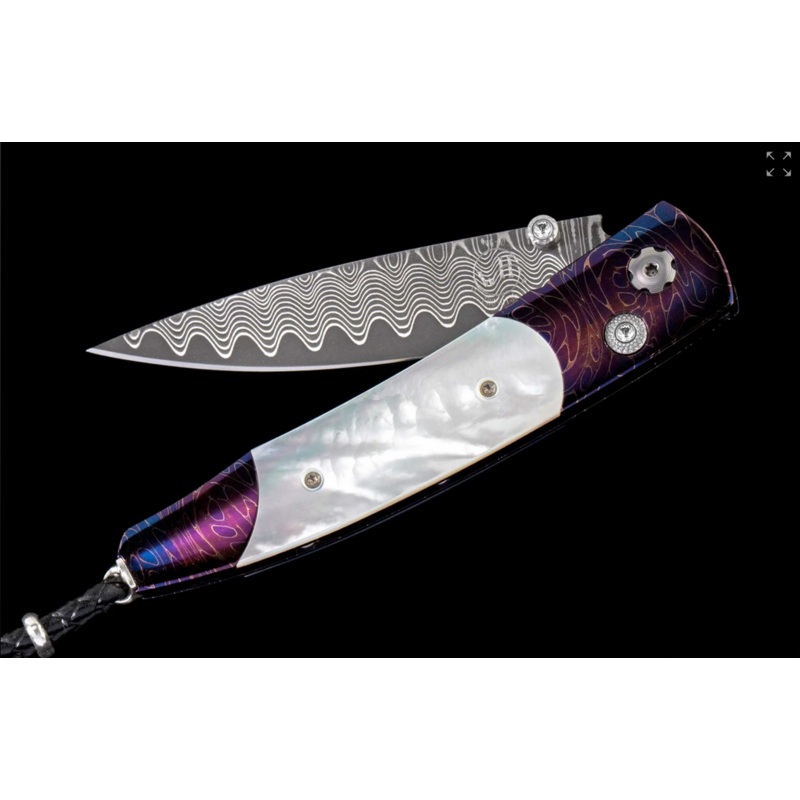 The Lancet ‘Blue Sand’ features a beautiful frame in hand-forged and heat-blued ‘Rolling Rock’ damascus by Chad Nichols, inlaid with mother of pearl. The blade is William Henry’s signature ‘Wave’ damascus with a core of VG-10; the one-hand button lock and the thumb stud are set with white topaz gemstones. Sleek, elegant, refined, and comfortable in the hand and to the eye, the Lancet defines the essential gentlemans folder in the modern world. The Blue Sand features some of the exotic materials, artistry, and hand-forged metals that are the hallmark of William Henry’s collections; a stunning personality statement to be used and worn for a lifetime, before handing it down to another generation.