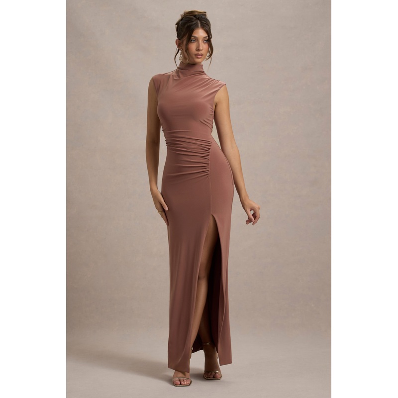 Lanetta | Chestnut Brown Ruched High-Neck Maxi Dress With Split