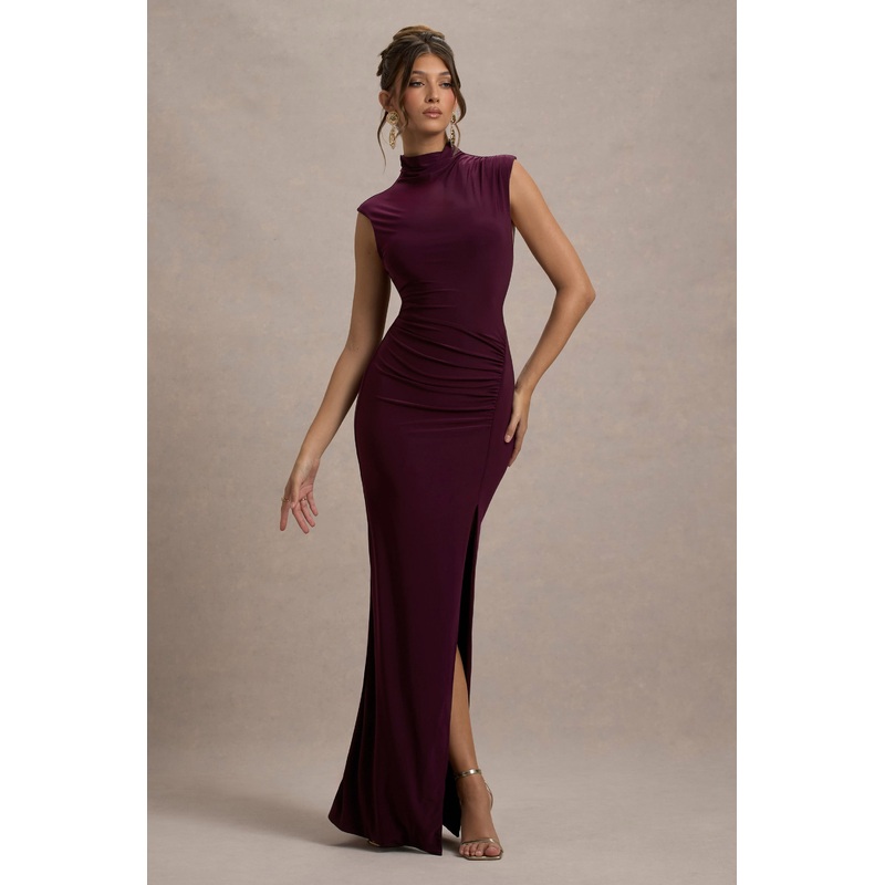 Lanetta | Plum Ruched High-Neck Maxi Dress With Split
