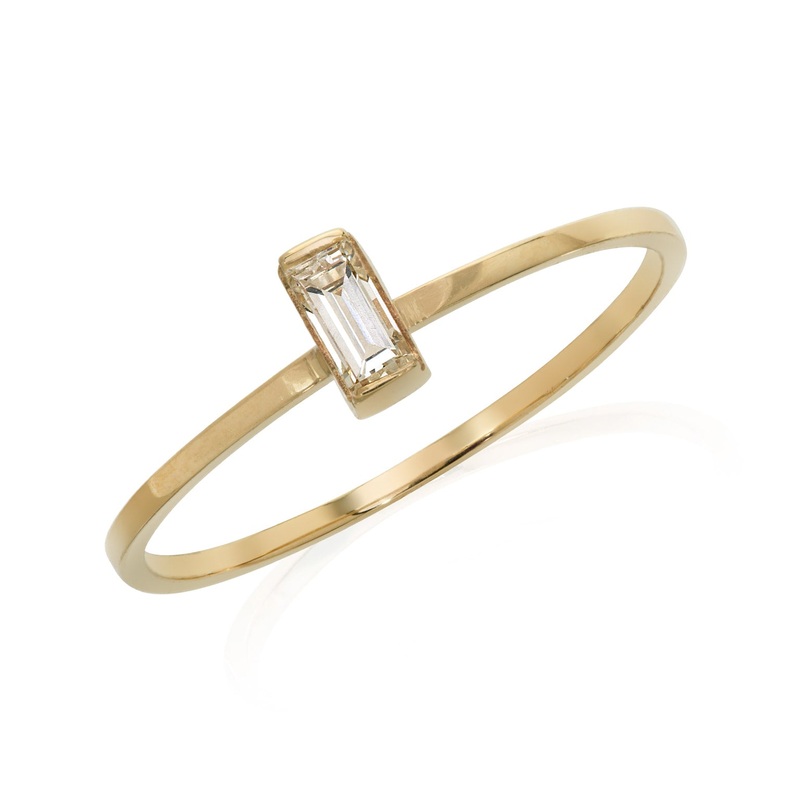 The Lantern Diamond Stacking Ring is one of the Giugno collection stacking rings, it features a baguette cut diamond, demi set in gold. The ring is a fine, square edged band, with the setting atop the band for it to stack neatly alongside other rings.Avail