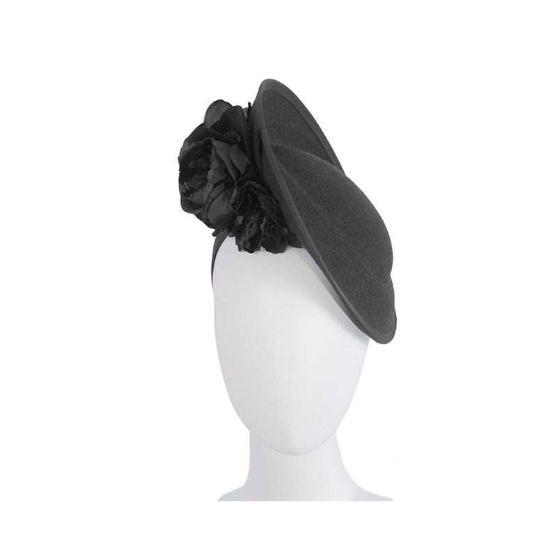 Designed to suit royals, this black fascinator features large round plate with generous flower bouquet. Made in Australia Posh Fillies Collection brand Stylish, modern design Comfortable headband
