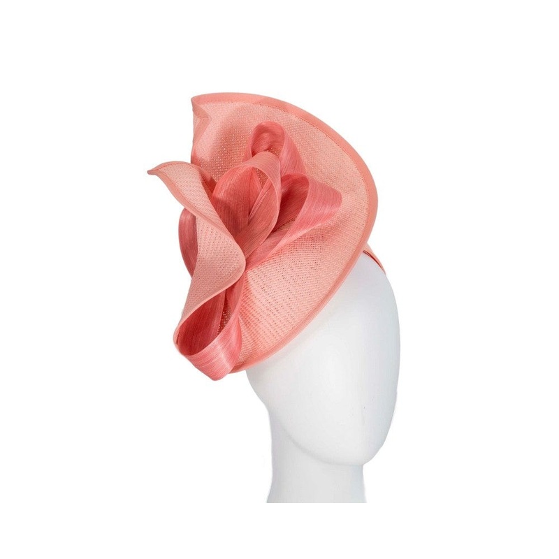 Large coral twisted plate decorated with silk abaca bow. Hand made in Melbourne by our skillful milliners, this headpiece will be a crown jewel of your spring racing outfit. Made in Australia Exclusive materials Stylish design by Fillies Collection Comfort
