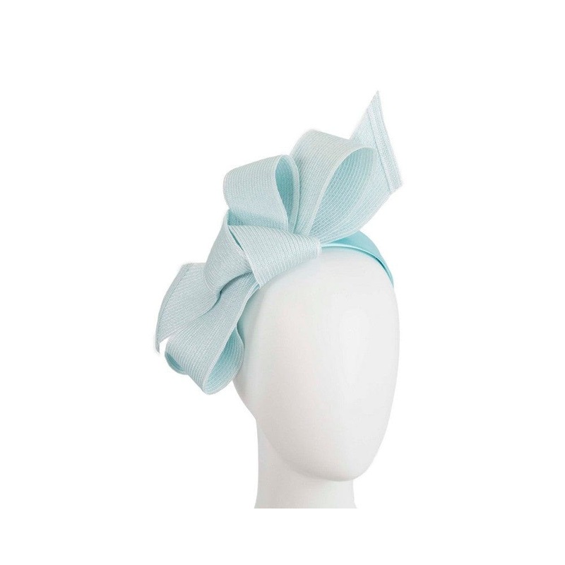 Light blue bow fascinator from latest Max Alexander racing collection. Hand made from of PU braid and placed on the on the comfortable headband. Designed in Australia Renown Max Alexander brand Comfortable headband
