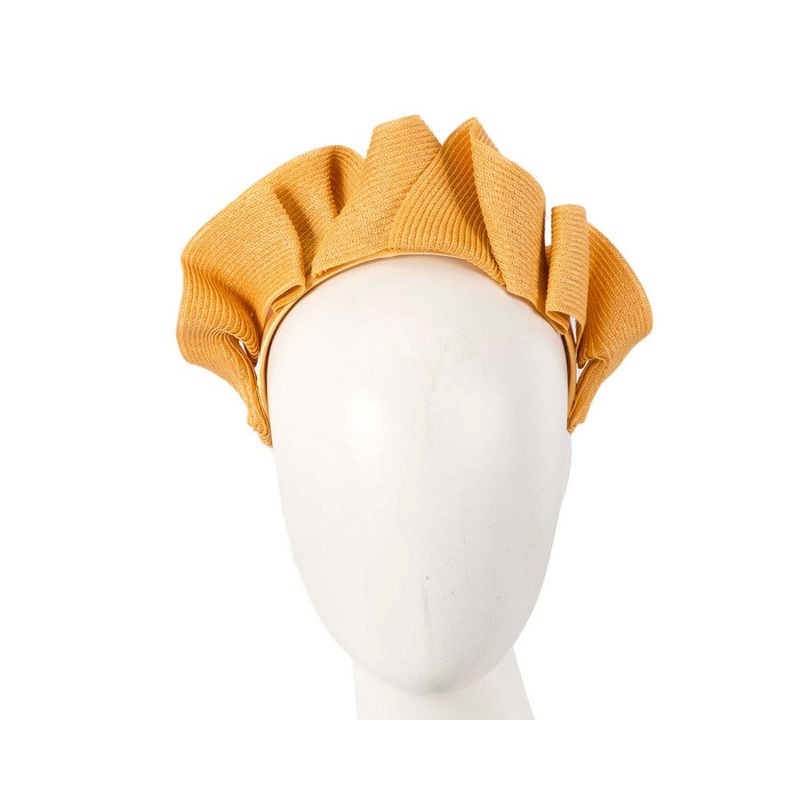 Mustard crown fascinator from latest Max Alexander racing collection. Waves of PU leather on the comfortable headband. Designed in Australia Renown Max Alexander brand Comfortable headband