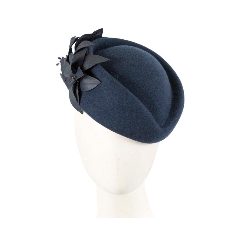Large elegant navy beret embellished with hand-made leafs. This felt beret hat is versatile and can be worn in different ways to suit your autumn or winter outfit. Made in Australia Pure wool felt Renown Fillies Collection brand