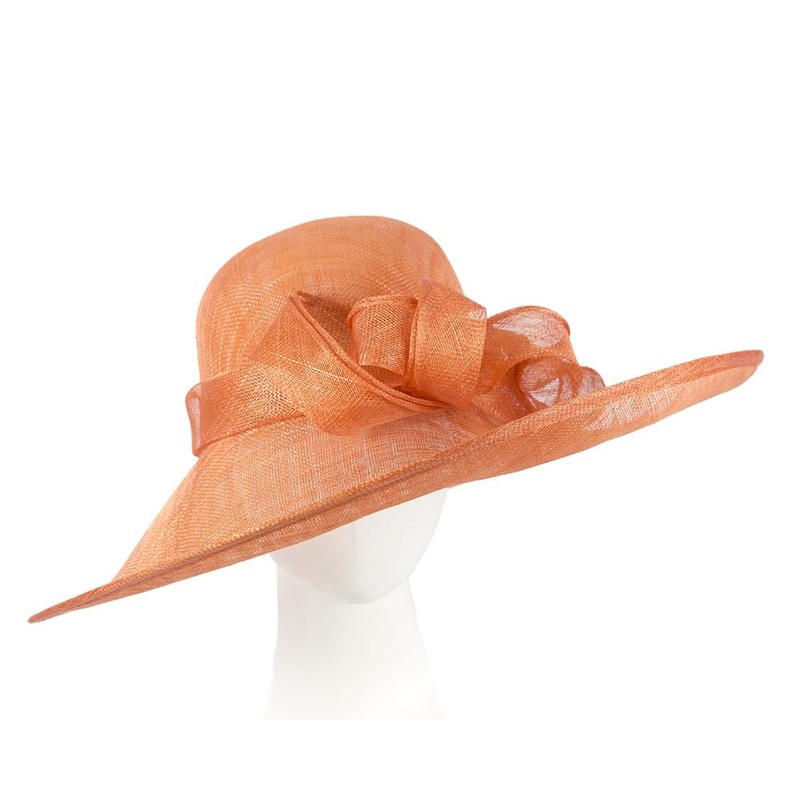 Wide brim orange racing hat made from pure sinamay and decorated with large bow. A great addition to any spring racing or special occasion outfit.Designed in AustraliaRenown Max Alexander brandWill fit size up to 58cm
