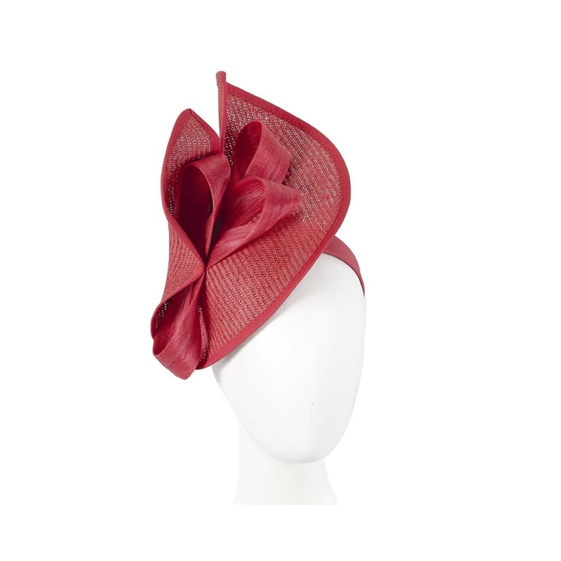 Large red twisted plate decorated with silk abaca bow. Hand made in Melbourne by our skillful milliners, this headpiece will be a crown jewel of your spring racing outfit.Made in AustraliaExclusive materialsStylish design by Fillies CollectionComfortable h