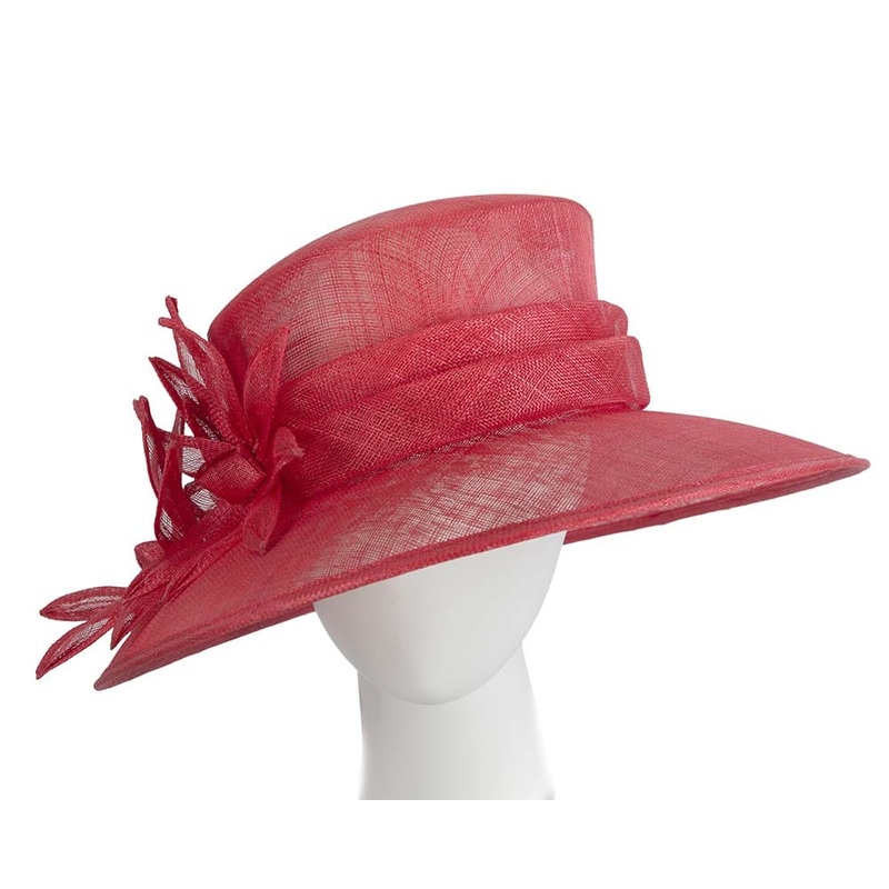 Made from finest sinamay, this large red hat sports traditional outline with wide brim and tall crown. Throw in bouquet of hand-made sinamay flowers and you have perfect racing hat for any occasion. Traditional ladies fashion hat Wide brim Will fit size up