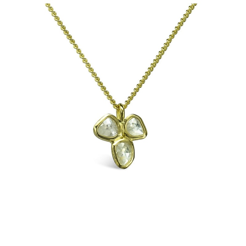 Natural Elegance: The Large Rough Diamond Trefoil Pendant captures the essence of nature’s beauty with its rough diamond slices and handcrafted 18ct yellow gold setting, creating an organic feel.