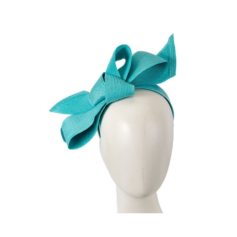 Turquoise bow fascinator from latest Max Alexander racing collection. Hand made from of PU braid and placed on the on the comfortable headband. Designed in Australia Renown Max Alexander brand Comfortable headband