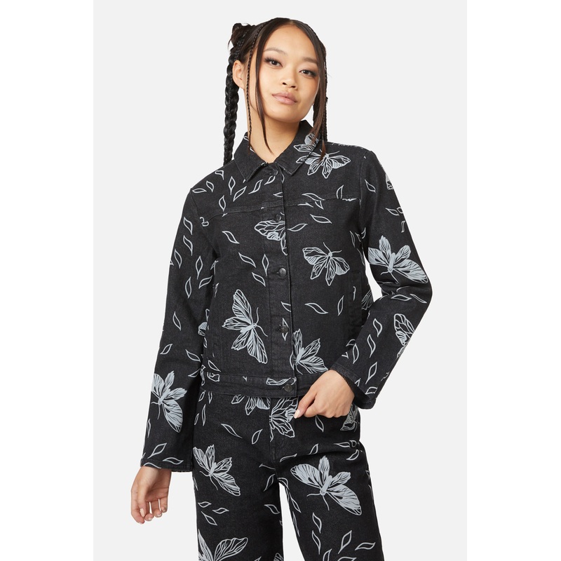 Flocked Denim Jacket-Features 'larvae' Flocked Denim Fabric-Boxy Fit-Full Body Length-Has Button Front For Closed And Open Wear-Made From Cotton Elastane Blend-Available In BlackProduct Code: BGFX112