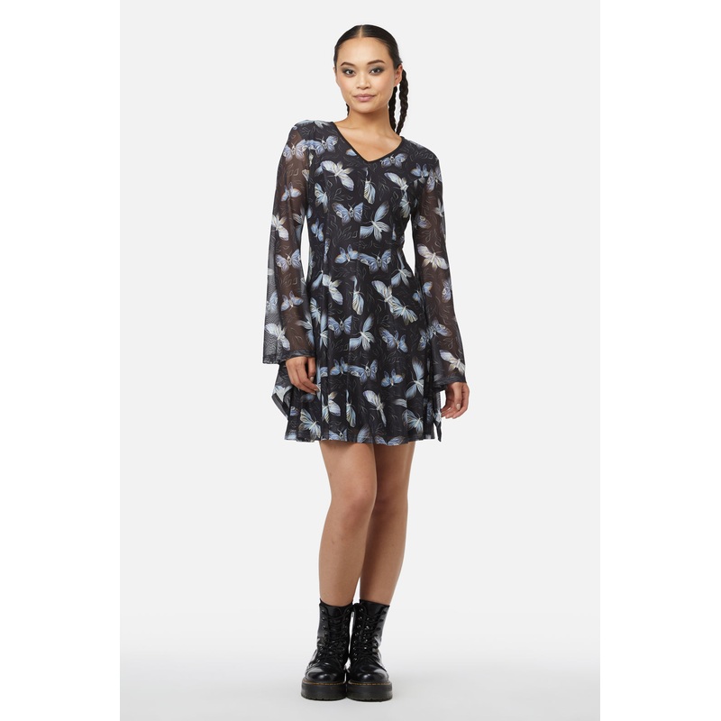 Graphic Mesh Dress-Features ‘larvae’ Print-Has Flared Sleeves-V Neckline-Stretch Fit-Made From Polyester Elastane Blend-Available In Black