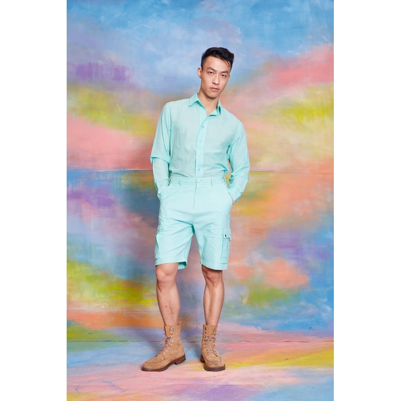 Daniel Shorts. Designed for the tasteful man who knows and appreciates the classics but is not afraid to explore the cutting-edge, these light-blue shorts will add a pop of color to your wardrobe. These shorts balance fine structure and style, pulling together high-quality materials and impeccable design. With functional belt loops and button closure, the shorts are made from relaxed-fitting cotton twill with in a green inspired by the color of the ocean. Features include an above-the-knee length, two side cargo pockets and two back pockets, and an all-season cotton twill fabric. Pair these shorts with our Coleman Shirt or a polo shirt and sneakers.