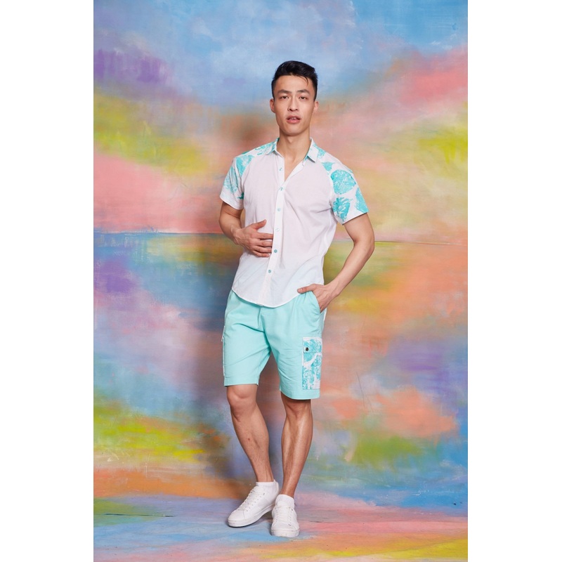 Joshua Shirt. This shirt is perfect for the man with artistic flair who is also masculine and appreciates contemporary fashion. This couture shirt boasts of light-blue hand-painted leaves that flow from the collar to the sleeves. Each shirt is unique and distinctive because the intricate hand painting process cannot be duplicated from one shirt to the next. The torso on the shirt is in a crisp white cotton, which provides an eye-catching contrast to the hand-painted leaves. Unparalleled in its sophistication, this shirt has short sleeves, a front-button closure, and a European silhouette. You can layer this over a white t-shirt and style it with shorts for poolside lounging. You can also style it with dark jeans and fashionable footwear for an evening in the city.