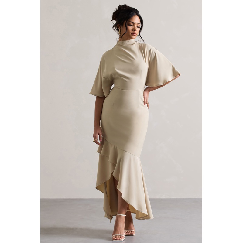 Lavinia | Champagne High-Neck Flutter-Sleeve Asymmetric Maxi Dress