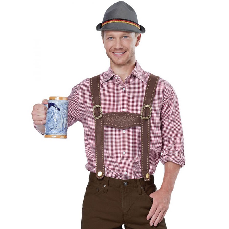 Get Ready to Celebrate!Make sure you fit right in at any Oktoberfest celebration with this Lederhosen Suspenders and Hat Kit. This pack comes with a grey trilby hat with the colours of the German flag around the trim and a pair of adjustable brown suspende
