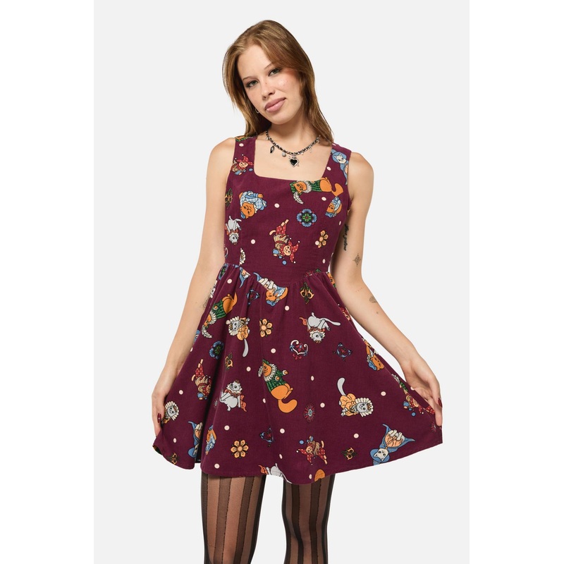 Printed Chord Dress - Features 'Left Right' Custom Artwork- Faux Corset Bodice- Flared Skirt Hem- Zipper Opening At Centre Back- Soft Chord Hand Feel- Made From Baby Corduroy- Available In MaroonProduct Code: BGFZ155