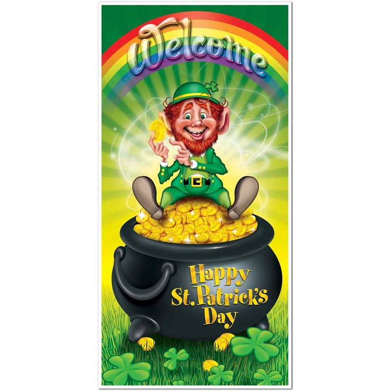 Luck of the IrishYour friends will feel like they've hit the jackpot when they see this Leprechaun Door Cover on your front door. The door cover features a leprechaun sitting on a pot of gold underneath a rainbow with the word 'Welcome' across it.Item Incl
